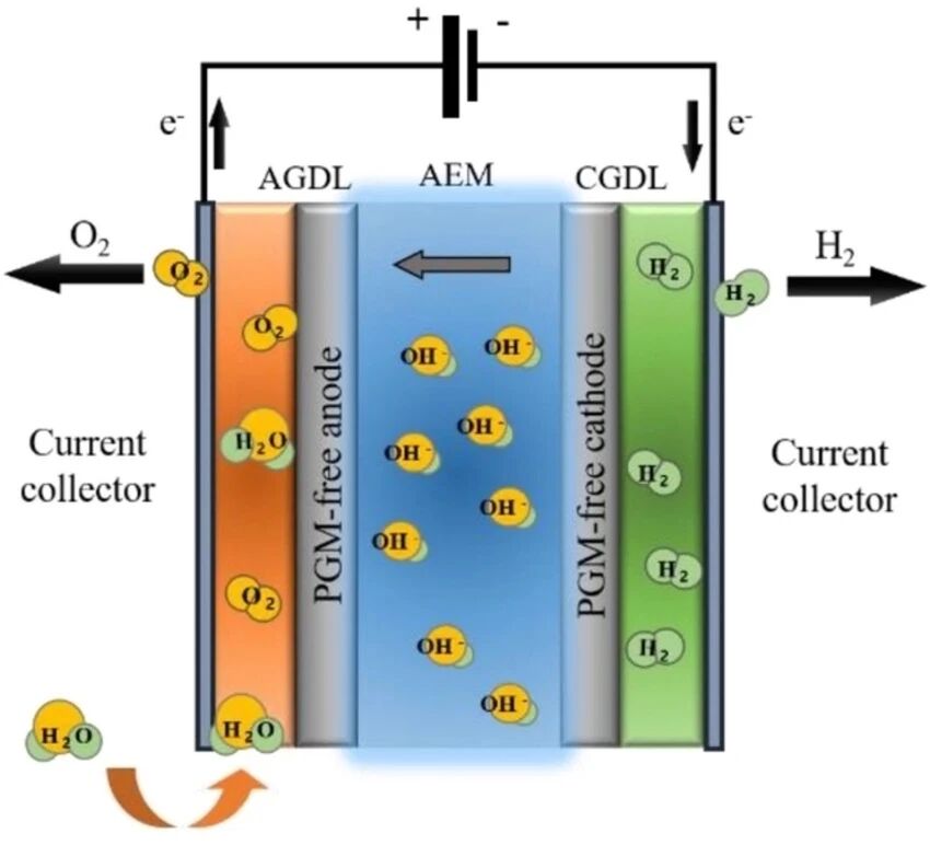 AEM(Anion Exchange Membrane)电解水制氢技术,以阴离子交换膜为核心电解质,通过电解纯水或低浓度碱性溶液产生氢气,系统主要由AEM隔膜、过渡金属催化电极、气体扩散层(GDL)、集流器和极框等部件构成。其工作原理清晰明确:在1.8-2.5V外加电压驱动下,阴极发生析氢反应(HER)生成氢气,阳极发生析氧反应(OER)生成氧气,AEM隔膜既实现氢氧气体的有效隔离,又允许氢氧根离子(OH⁻)从阴极向阳极迁移,平衡电极反应的电荷与反应物需求,而电解液循环则为阳极反应提供原料并带走氧泡。