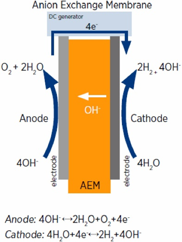 - 工作机制:阴极生成H₂与OH⁻,OH⁻通过阴离子交换膜迁移至阳极发生氧化反应,可采用非贵金属催化剂(如镍基、铁基材料)。